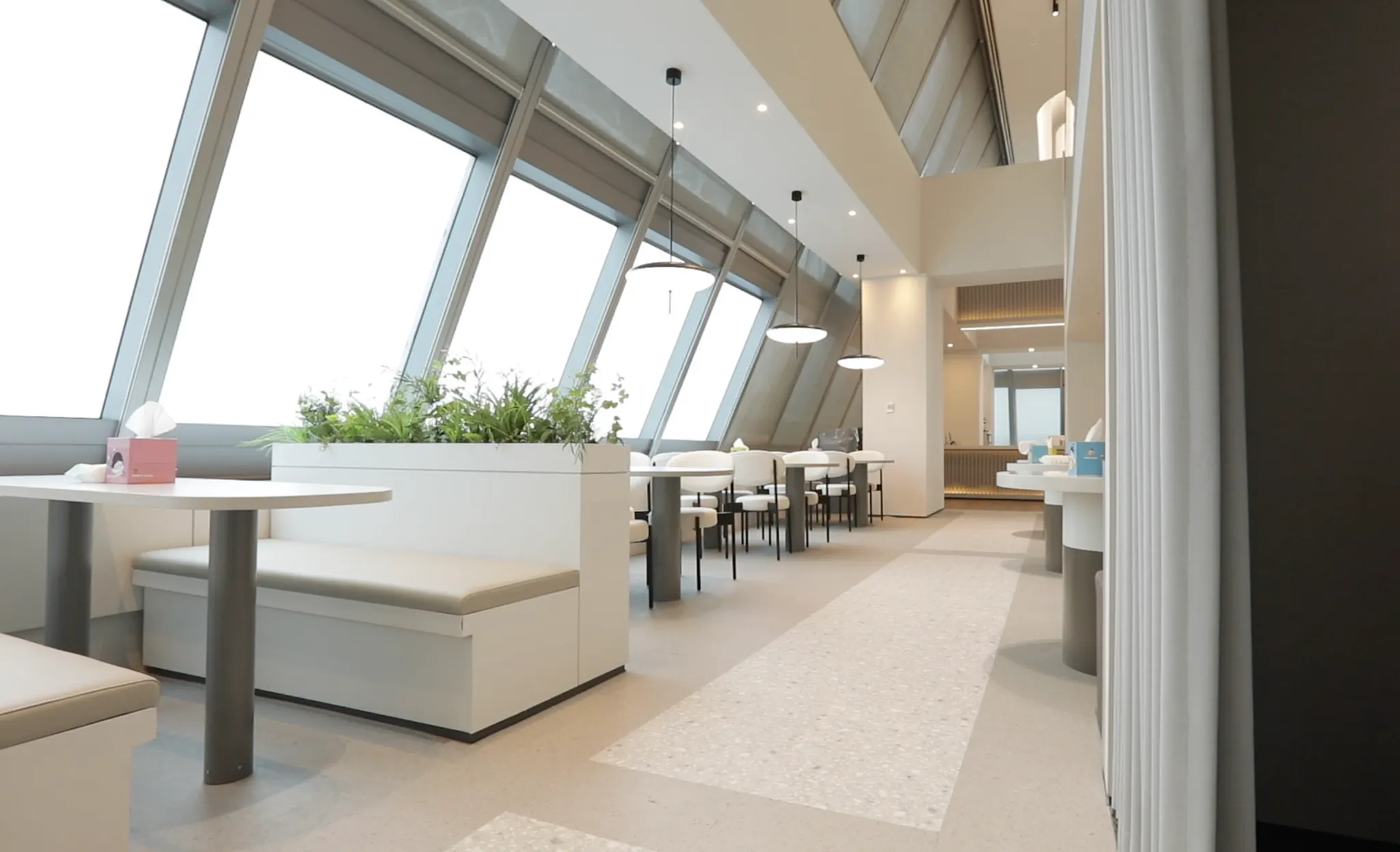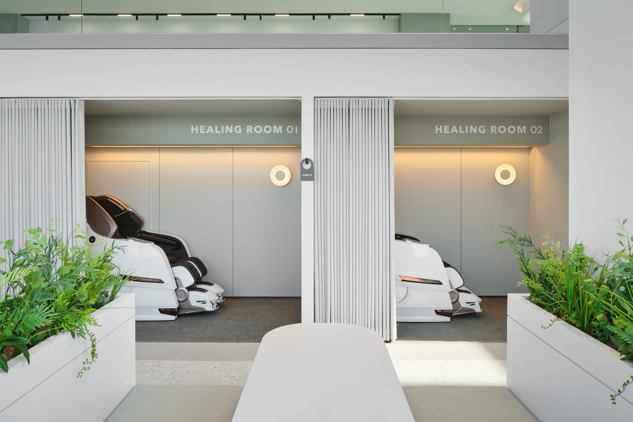 [힐링룸] 휴식이 필요할 때는 안마의자에 누워 피로와 긴장을 풀 수 있어요. 아늑한 밝기의 조명과 커튼으로 분리된 나만의 공간에서 힐링하는 시간을 가져요.